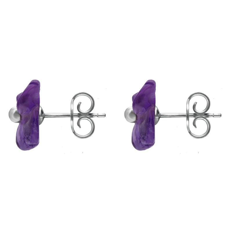 These feminine earrings are part of our Tuberose handmade jewellery collection and feature exquisite hand crafted pieces of Amethyst stone. The gemstones have been cut and carved in a unique and detailed clover design, to showcase the natural beauty of the Amethyst, which is set within sterling silver settings. The earrings are completed with post and butterfly fastenings, for secure everyday wear.