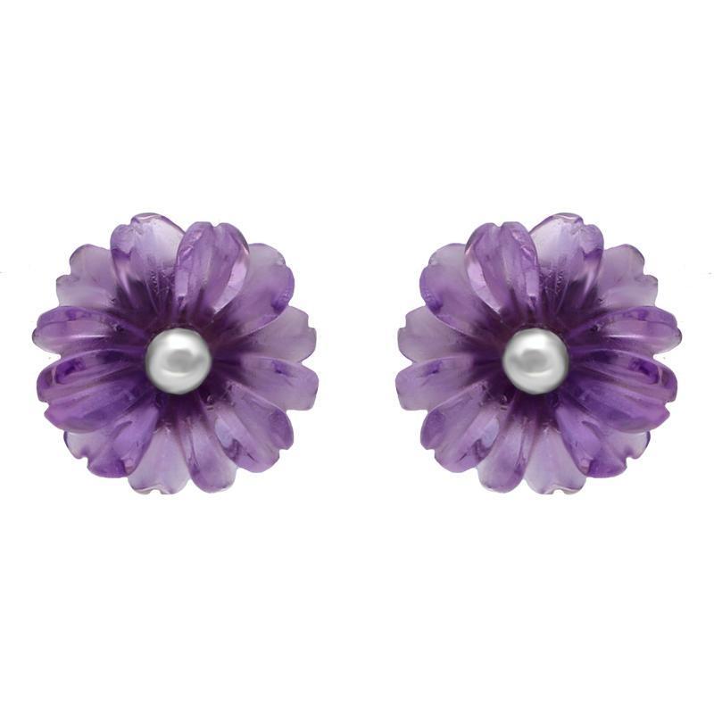 These feminine earrings are part of our Tuberose handmade jewellery collection and feature exquisite hand crafted pieces of Amethyst. The gemstones have been cut and carved in a unique and detailed daisy design, to showcase the natural beauty of the Amethyst, which is set within sterling silver settings. The earrings are completed with post and butterfly fastenings, for secure everyday wear.