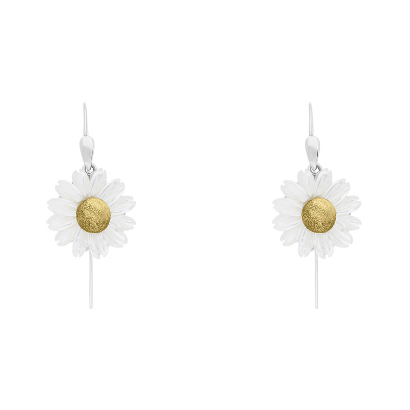 These feminine drop earrings are part of our Tuberose handmade jewellery collection and feature exquisite hand crafted pieces of White Mother of Pearl. The gemstones have been cut and carved in a unique and detailed daisy design, which is accentuated by yellow gold plating to add a touch of colour to the daisies. The earrings are completed with sterling silver hooks, for easy everyday wear.