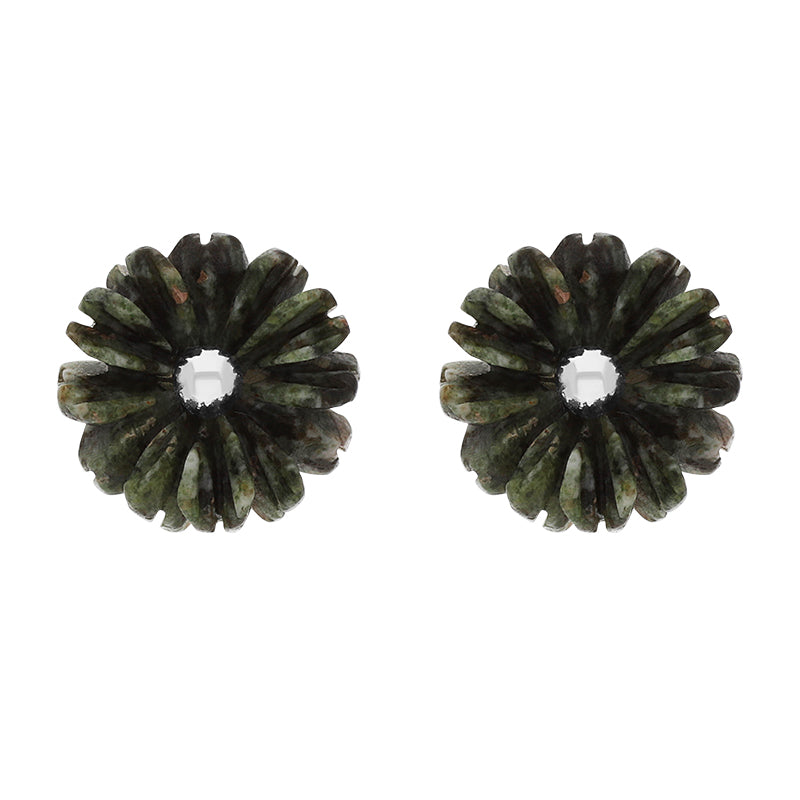 These feminine earrings are part of our Tuberose handmade jewellery collection and feature exquisite hand crafted pieces of Preseli Blue Stone. The gemstones have been cut and carved in a unique and detailed desert rose design, to showcase the natural beauty of the Preseli Blue Stone, which is set within sterling silver settings. The earrings are completed with post and butterfly fastenings, for secure everyday wear.