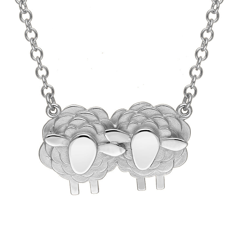 This unique necklace features a pair of adorable sheep, each with a polished sterling silver face. The necklace is completed with a sterling silver chain which fastens with a classic bolt ring style clasp.