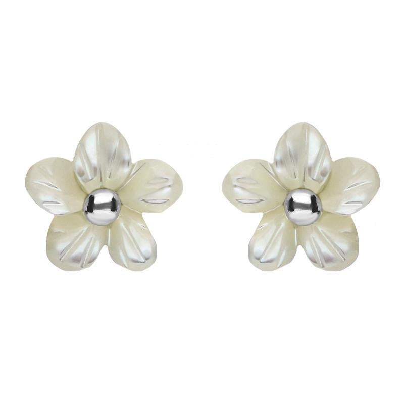Whitby Jet Store Sterling Silver White Mother of Pearl Tuberose Pansy Stud Earrings, E2152.