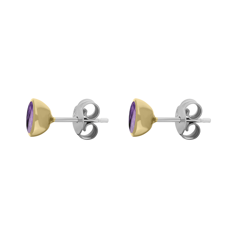 These stud earrings feature highly polished genuine Blue John set in 9ct yellow gold frames with sterling silver post and butterfly fastenings.