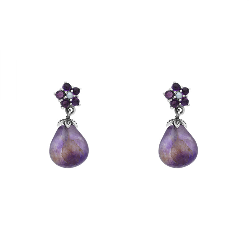 Sterling Silver Blue John Amethyst Pearl Flower Top Drop Earrings