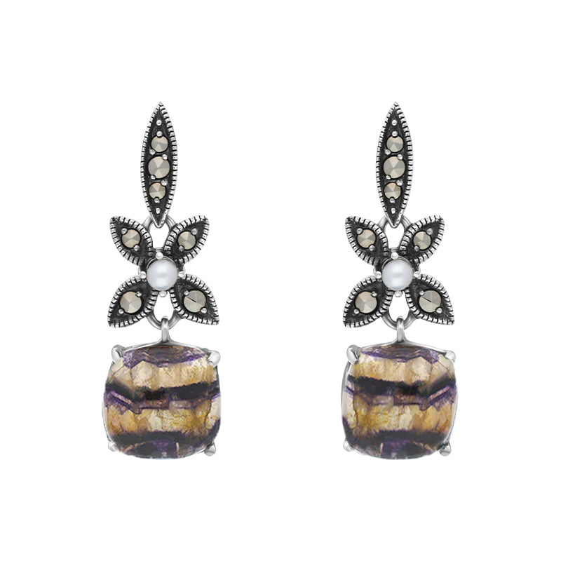 These charming earrings features the finest Blue John and Marcasite. The intricate design combines the Blue John and Marcasite with Pearl which creates a stunning contrast between sterling silver and makes the perfect earrings for someone looking for a beautifully unique piece.