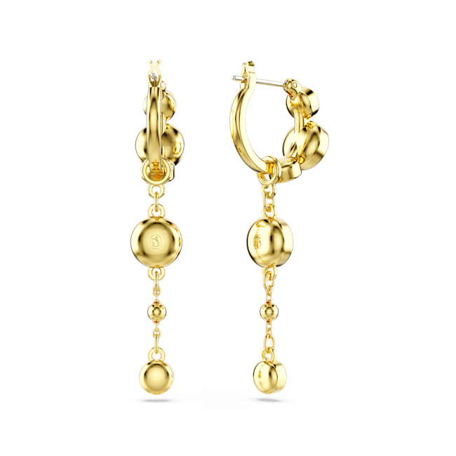 Made for light-catching movement, these pierced earrings are a striking way to elevate any outfit. Each gold-tone plated piece features a mini hoop with a removable dangling chain, embellished all over with round-cut crystals in a puffy bezel setting and a shiny metal droplet. A versatile choice for those who love to stand out from the crowd.