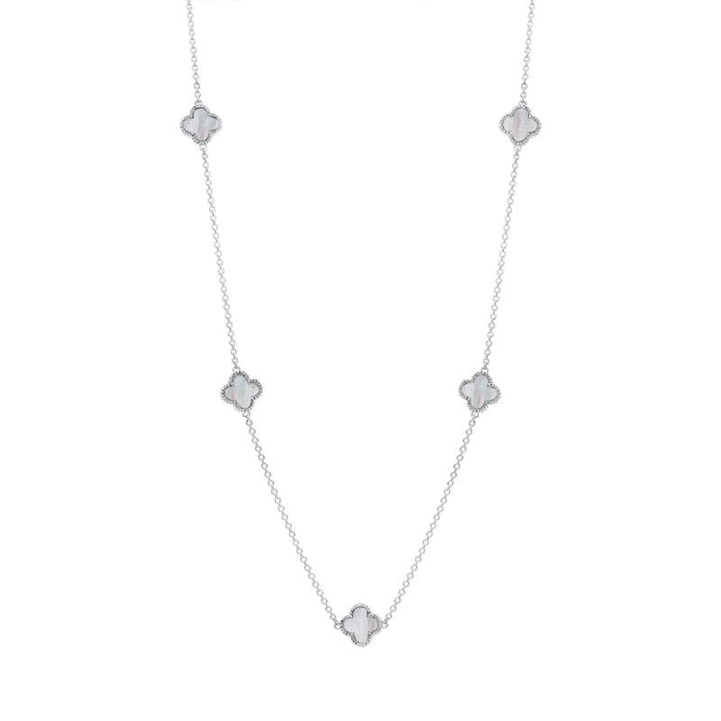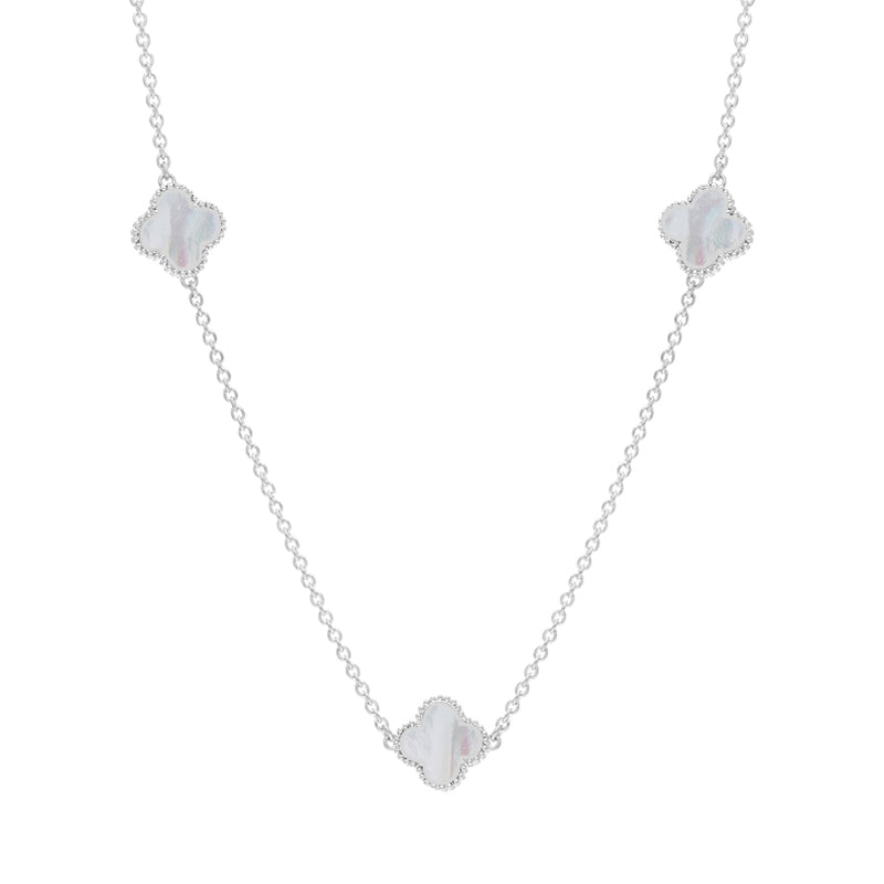 Sterling Silver White Mother of Pearl Bloom Four Leaf Clover Ball Edge Necklace