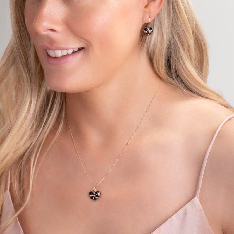 This beautiful set features a gorgeous flower motif that has been hand crafted in the finest Whitby Jet, set inside a solid 18ct rose gold heart. A sparkling brilliant cut diamond adds stunning detail to the design. Total diamond carat weight for the set is 0.025ct. The perfect gift for any occasion! The reverse of the pendant features highly polished Whitby Jet. Comprising of a pair of drop earrings, and necklace, complete with an 18 inch 18ct rose gold chain. All items can be sold separately. Dimensions; Necklace; 12mm x 15mm plus 5mm bale. Earrings; 11mm x 13mm.