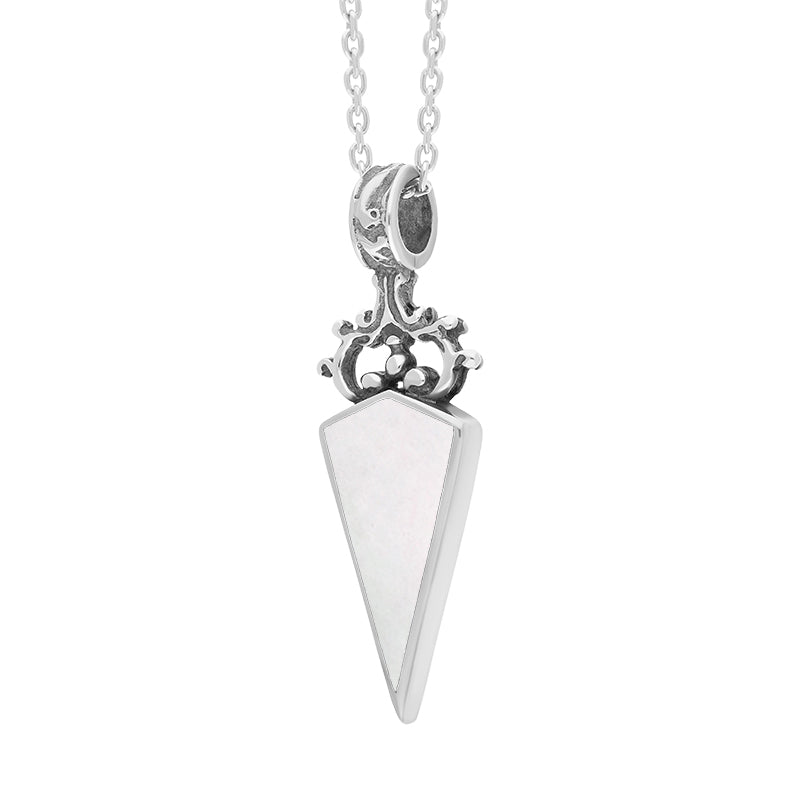 18ct White Gold Blue John White Mother Of Pearl Double Sided Scroll Top Dagger Fob Necklace, P423.