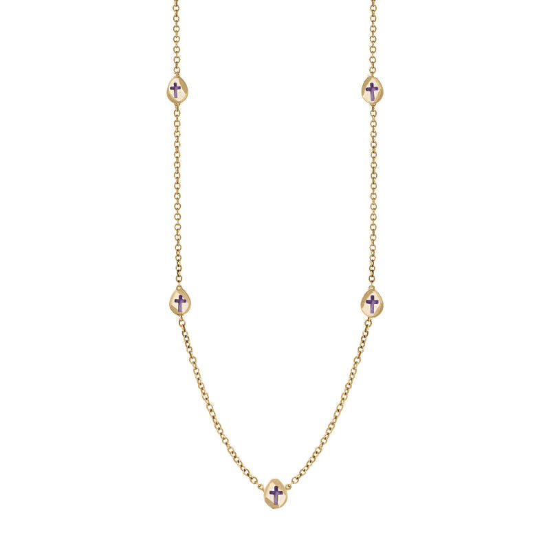 This on trend 18ct yellow gold chain necklace features petite discs embellished with cross shaped fine Blue John stones that have been sourced directly from the North East coast of Yorkshire.