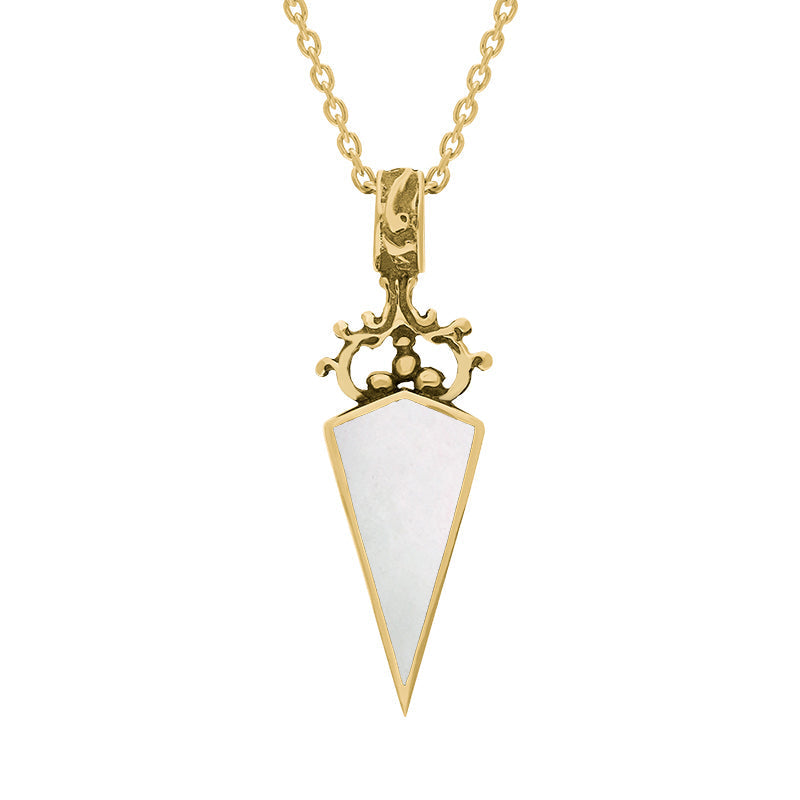 This classic double sided fob necklace is part of our Heritage handmade jewellery collection and features a dagger shaped locally sourced Blue John gemstone on one side and a White Mother Of Pearl gemstone on the other. The stones are framed within a heavy highly polished 18ct Yellow Gold setting with a scroll shaped bail. This item is complete with an 18 inch yellow gold chain.