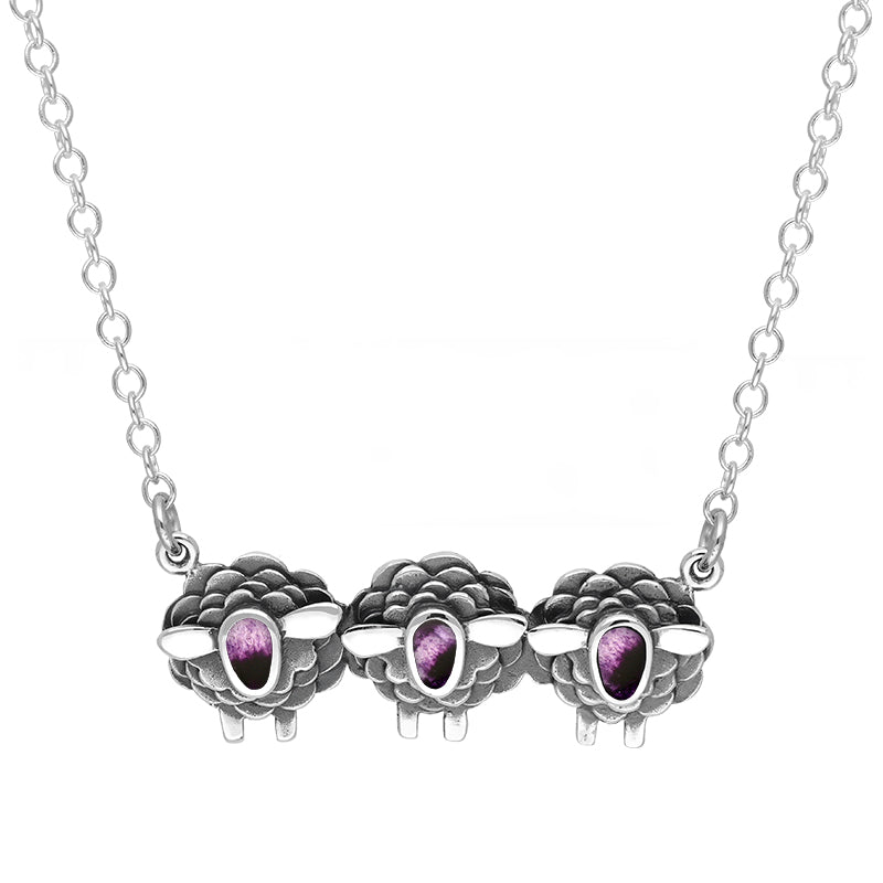 This unique necklace features a row of three adorable sheep, each with their very own Blue John face. The necklace is completed with a 9ct white gold chain which fastens with a classic bolt ring style clasp.