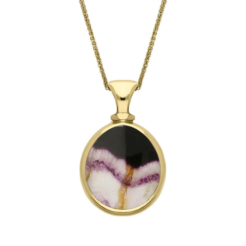 This beautiful double sided pear shaped fob style necklace features the finest Blue John and White Mother Of Pearl. The hand carved gemstones are flush set into the organic, contemporary pear shape giving a smooth and highly polished finish. Sold complete with an 18 inch 9ct yellow gold chain which fastens with a classic bolt ring style clasp.