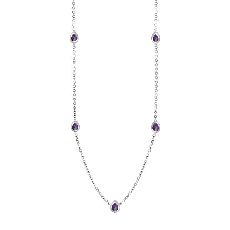 This on trend sterling silver chain necklace features petite discs embellished with Fleur De Lis shaped fine Blue John stones that have been sourced directly from the North East coast of Yorkshire.
