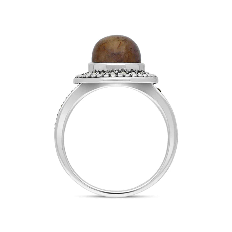 This statement ring features a large oval piece of hand carved Blue John, sourced directly from Castleton, Derbyshire. The stone is placed within an exquisite sterling silver round setting and has been embellished by dazzling marcasite stones, bringing a sophisticated sparkle to the piece. The detail on this ring continues onto the band to give an elegant finish.