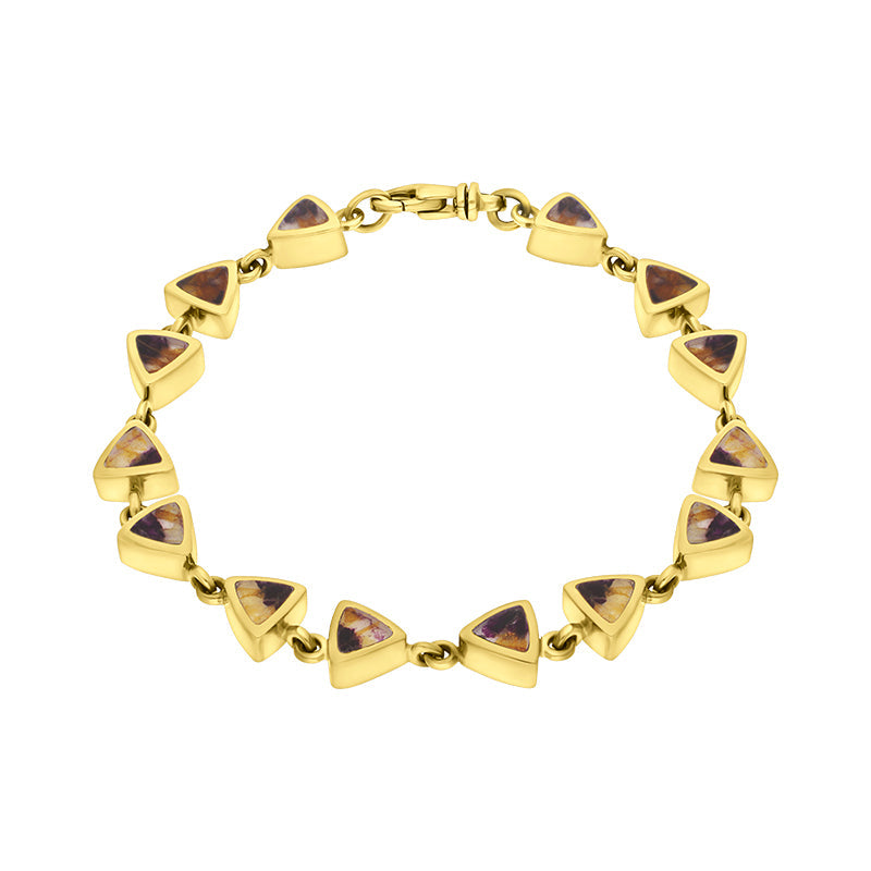 This statement bracelet features 14 curved triangle shaped highly polished Blue John gemstones which are set in 9ct Yellow Gold. The bracelet is secured by a solid lobster clasp fastening.