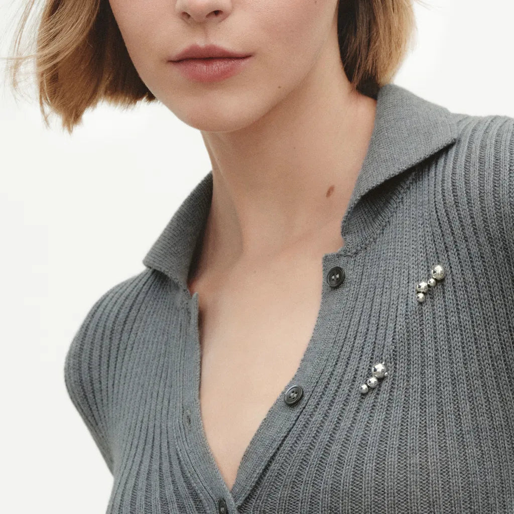 This sleek Moonlight Grapes knitwear brooch is adorned with delicate strings of silver beads at each tip, expertly shaped to resemble the grapes that adorned some of Georg Jensen’s holloware creations from the early 1900s. It’s a chic and contemporary update of the iconic motif, adding a unique touch to any ensemble. We recommend using this brooch exclusively on knitwear.