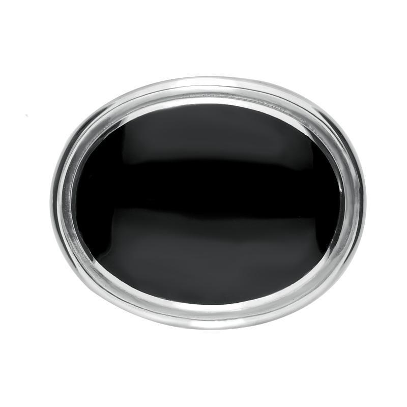 This Contemporary brooch features a stunning oval shaped cabochon of the finest Whitby Jet stone, sourced directly from the north east coast of Yorkshire. The beautiful Sterling Silver brooch is perfect for every occasion. The brooch fastens with a horizontal bar pin.