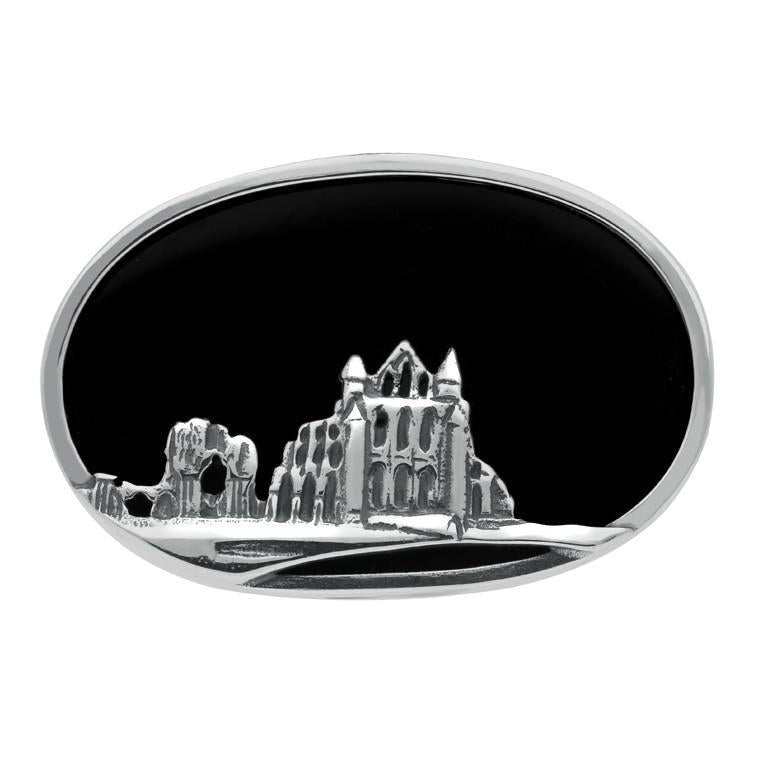 This exquisite brooch features a stunning oval shaped cabochon of the finest Whitby Jet stone, sourced directly from the north east coast of Yorkshire. The beautiful sterling silver frame represents the unique origin of Whitby Jet featuring an intricate handcrafted Whitby Abbey. The Abbey is a perfect symbol for Whitby as it dominates the skyline of the small fishing town. The brooch fastens with an horizontal bar pin for easy wear.