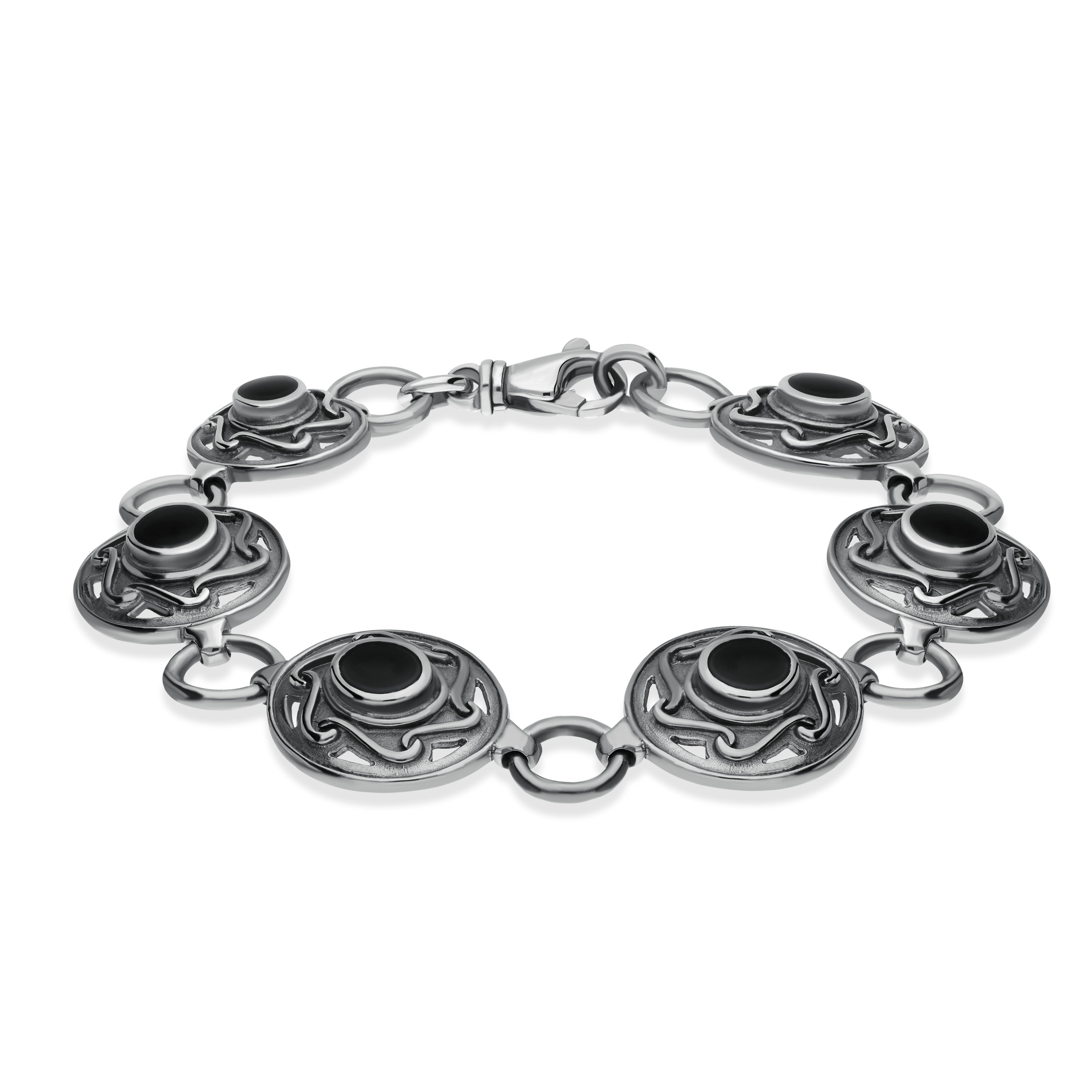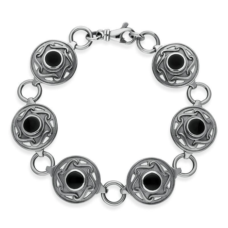 This traditional bracelet features 6 pieces of round cabochon, hand-carved original Whitby Jet gemstones, with each one polished to an immaculate shine. Each stone is surrounded by a wide Celtic style sterling silver open framework, linked together with neat and sturdy circular links. The bracelet fastens with a classic and secure lobster claw-catch.