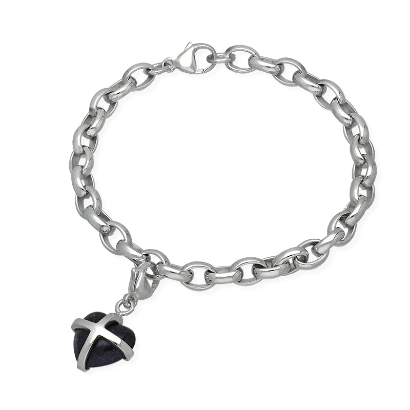 Sterling Silver Blue Goldstone Small Cross Heart Charm Bracelet, B1209