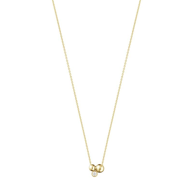With its two beads of 18ct yellow gold clustered together with a single brilliant cut diamond, this pendant is an understated but luxurious piece of jewellery. Combining classic elegance with contemporary sophistication, the pendant looks beautiful worn alone or even more special when paired with the matching earrings. The Moonlight Grapes collection takes a grape detail seen in some of Georg Jensens early Art Nouveau masterpieces and abstracts and modernises it to create something entirely new. The result is organic and contemporary but with a reference to the past that makes the collection a timeless classic. The pendant is expertly crafted from 18ct yellow gold with a 0.07 ct diamond. It hangs from a fine gold chain.