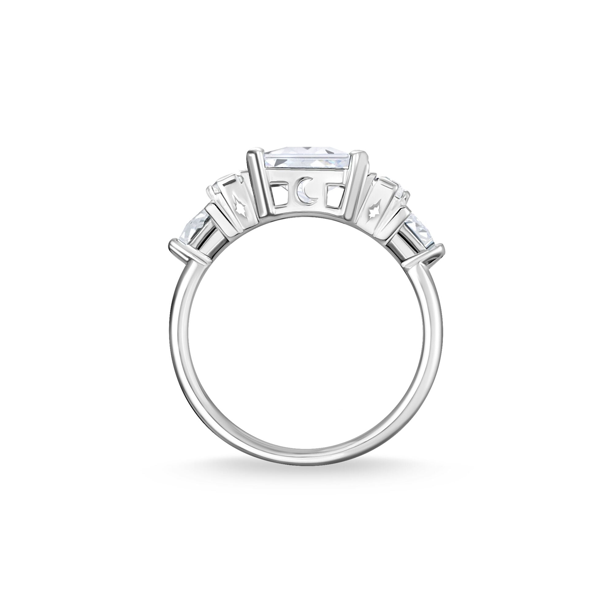 Strikingly light-reflecting zirconia stones give this silver ring a special radiance. All stones are individually hand-cut and hand-set. Small moon and star cut-out designs appear on the claw settings and provide a magical effect.