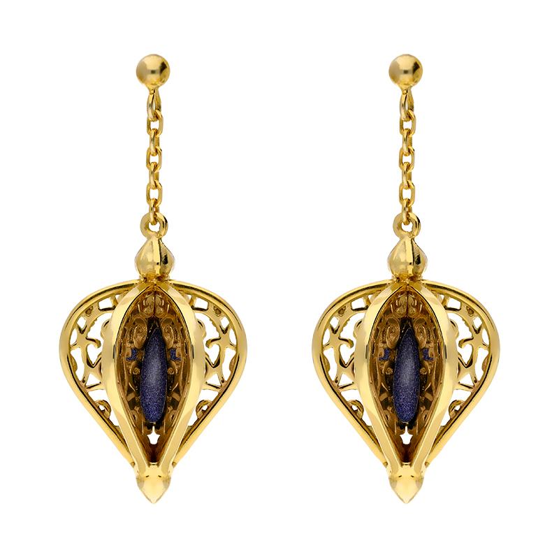 9ct Yellow Gold Blue Goldstone Flore Filigree Drop Earrings