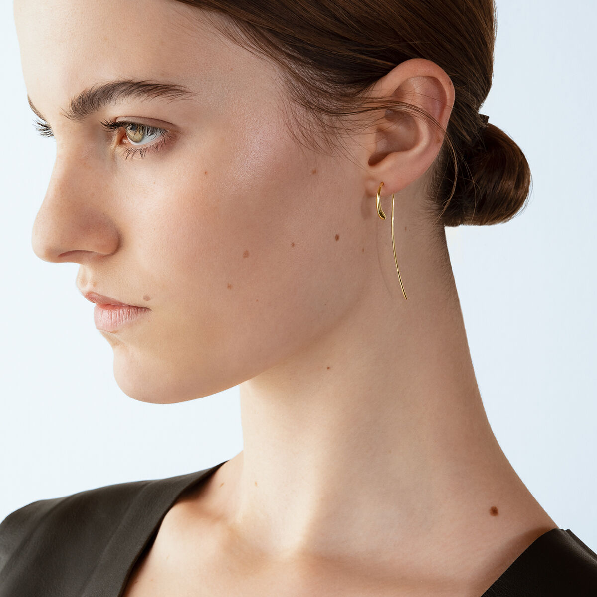 The Mercy earring hangs beautifully from the ear lobe, almost like a simple sculpture. A single thread of 18ct yellow gold is bent into a sleek, delicate ear ring with a particular sense of lightness.