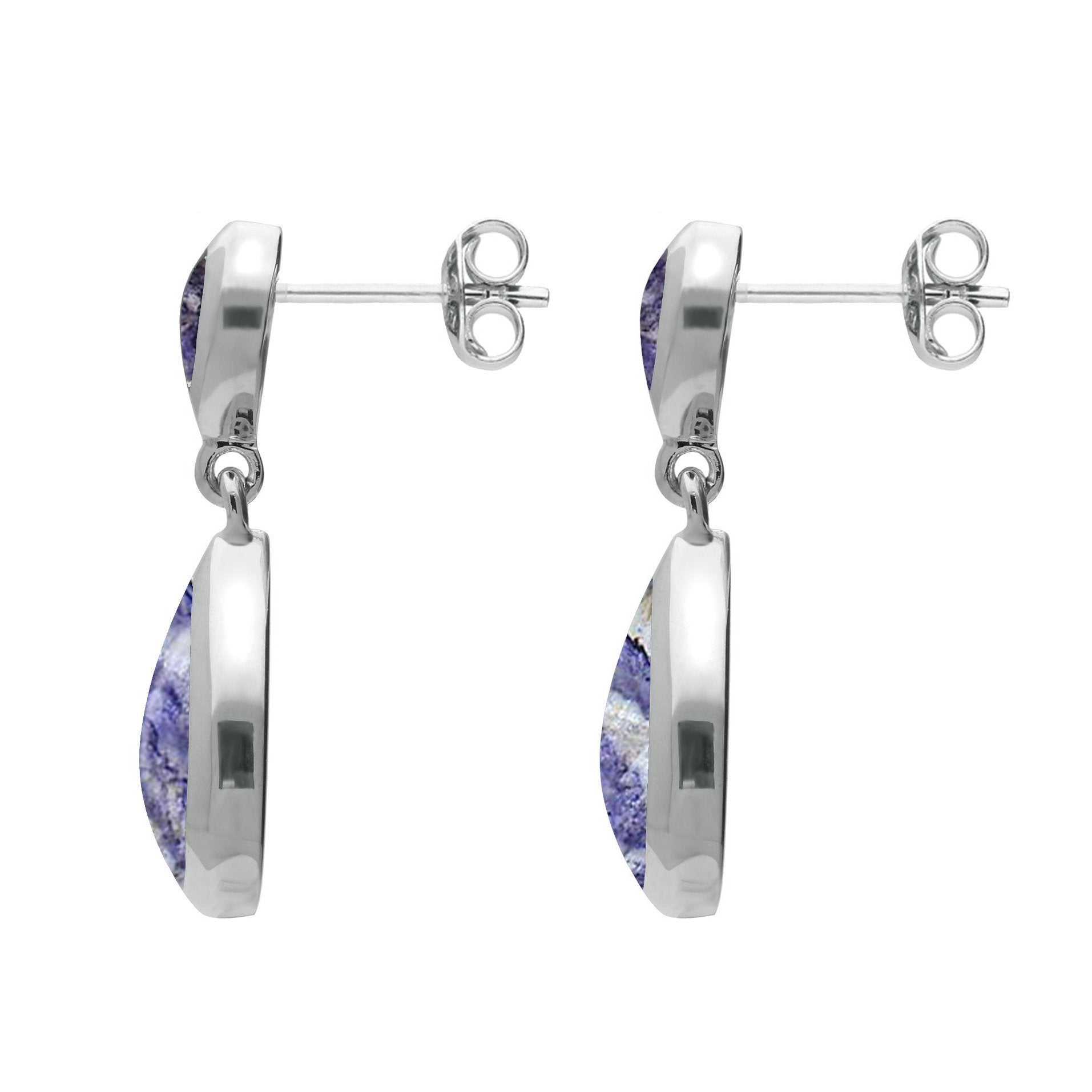 These graceful double pear drop earrings feature two hand carved pieces of the finest Blue John sourced from Castleton in Derbyshire which is set in solidly backed sterling silver. A classic and elegant pair of earrings suitable for any occasion. Secured with a silver post and butterfly fastening. Dimensions: 25mm x 10mm.
