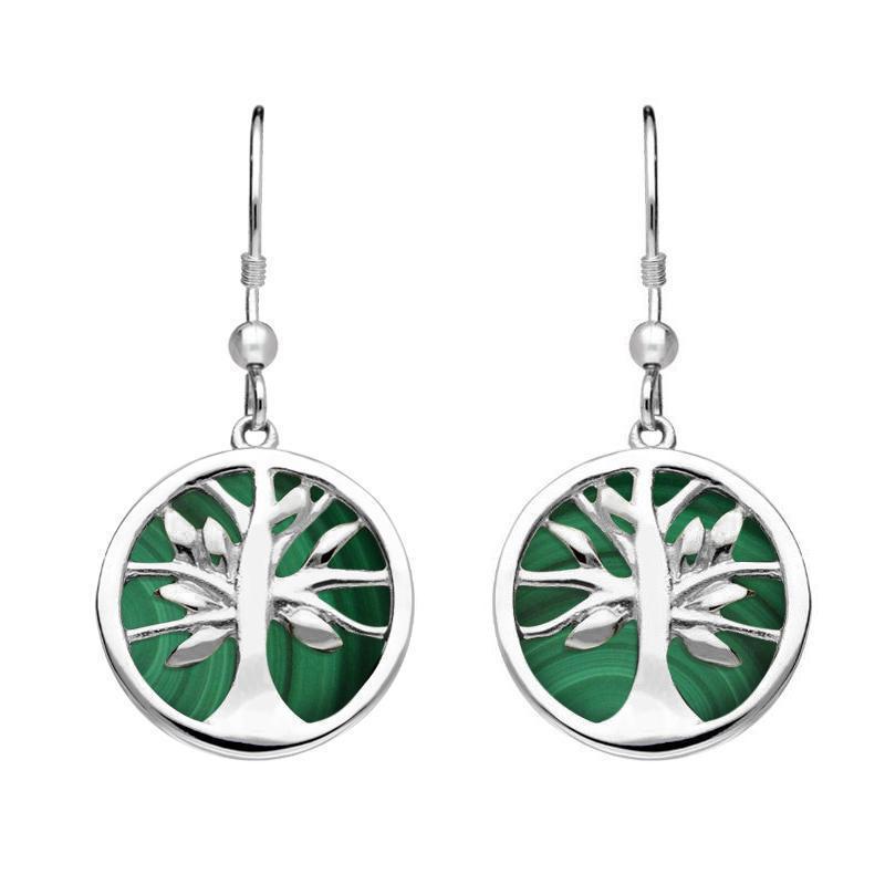 Sterling Silver Malachite Round Tree of Life Drop Earrings, E2485.