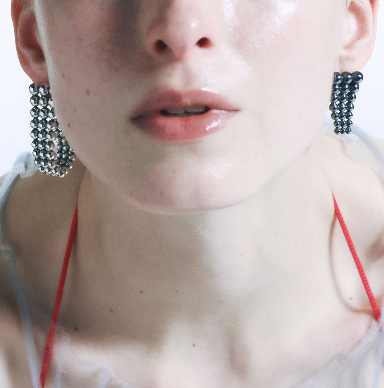 Referencing the collection's designs, where rows of silver beads graduate in size, this single earring carries a unique expression. Crafted in recycled sterling silver, oxidised to give the design its dark grey hue, the earring is designed in collaboration with Danish design brand A. Roege Hove. The piece (sold singularly) can be worn solo, in pairs or matched with other designs from the collection.