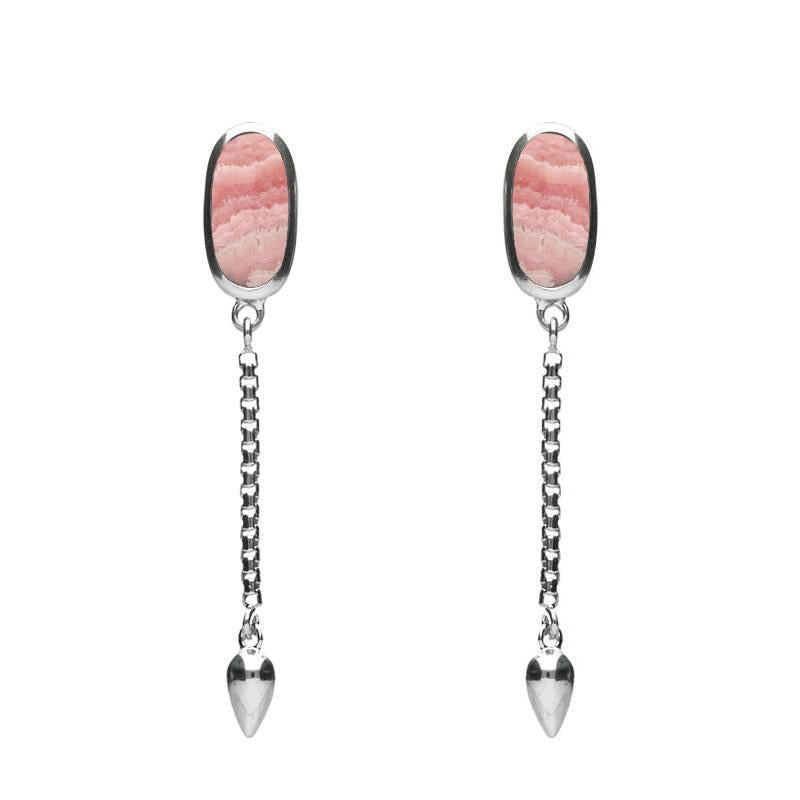 These elegant long drop stud earrings feature long, hand cut oval Rhodochrosite gemstones framed in contemporary sterling silver settings. Fluid 20mm long chains flow from beneath the stones and they are finished with teardrop shaped sterling silver beads. The earrings are completed with classic post and butterfly studs.