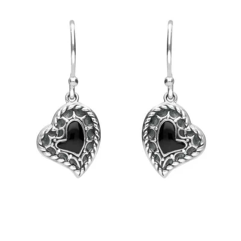 Sterling Silver Whitby Jet Oxidised Heart Drop Earrings