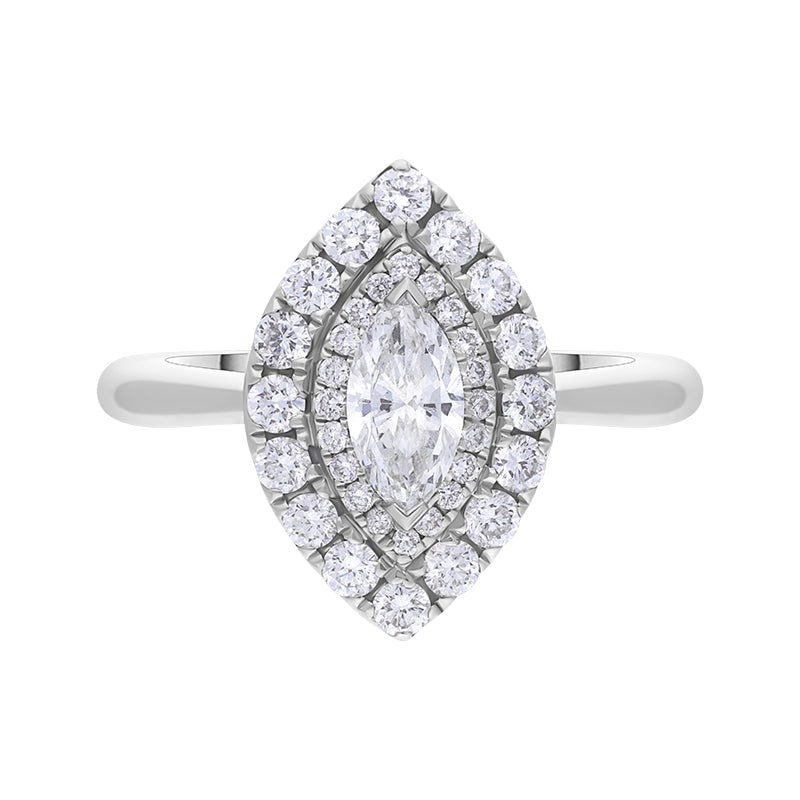 This elegant platinum ring features one large 0.30ct marquise cut diamond. beautifully framed with two rows of 0.42cts of brilliant cut diamonds. A perfect addition to any jewellery lovers collection. The diamonds are GIA certified with an excellent F colour and VS1 clarity.