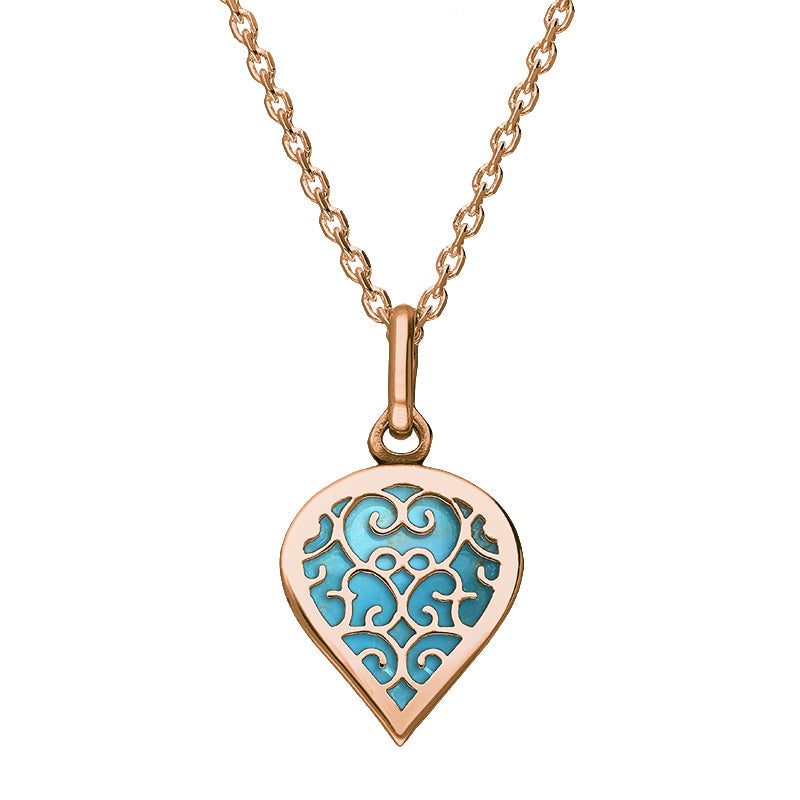 9ct Rose Gold Turquoise Flore Filigree Small Heart Necklace. P3629.