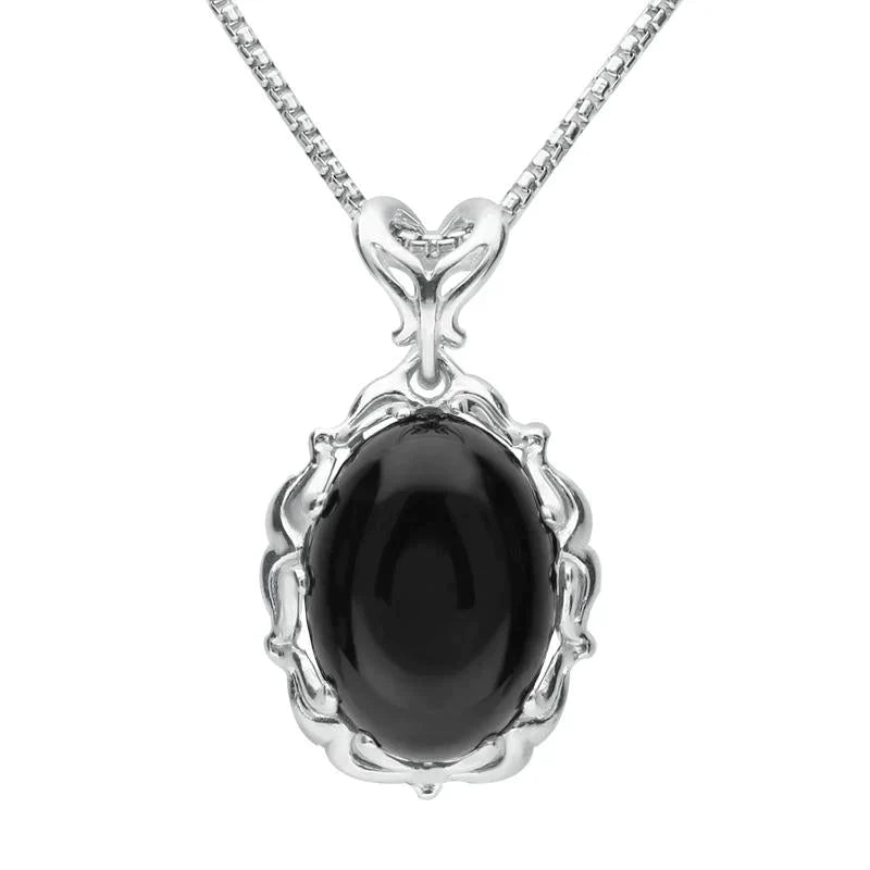 This delicate oval pendant has been hand crafted within our workshops by our expert jewellery craftsmen. It features a hand carved oval shaped Whitby Jet gemstone that is set within a decorative sterling silver frame detailing, and a bail featuring the same design. This item is supplied with an 18 inch silver chain. A pretty pendant perfect for everyday wear.