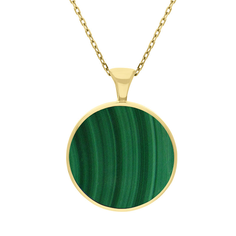 18ct Yellow Gold Whitby Jet Malachite Large Double Sided Round Fob Necklace, P012.