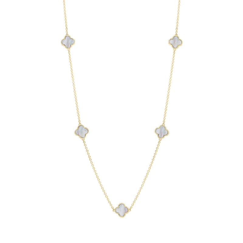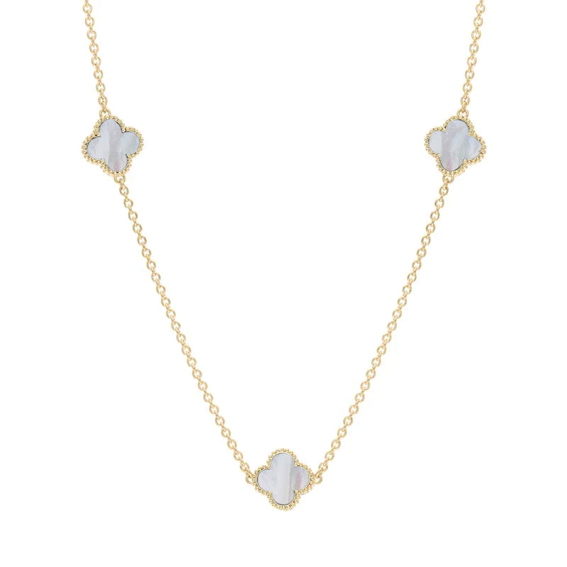 • 18ct Yellow Gold White Mother of Pearl Bloom Four Leaf Clover Ball Edge Necklace - N1154 (BLM-462)