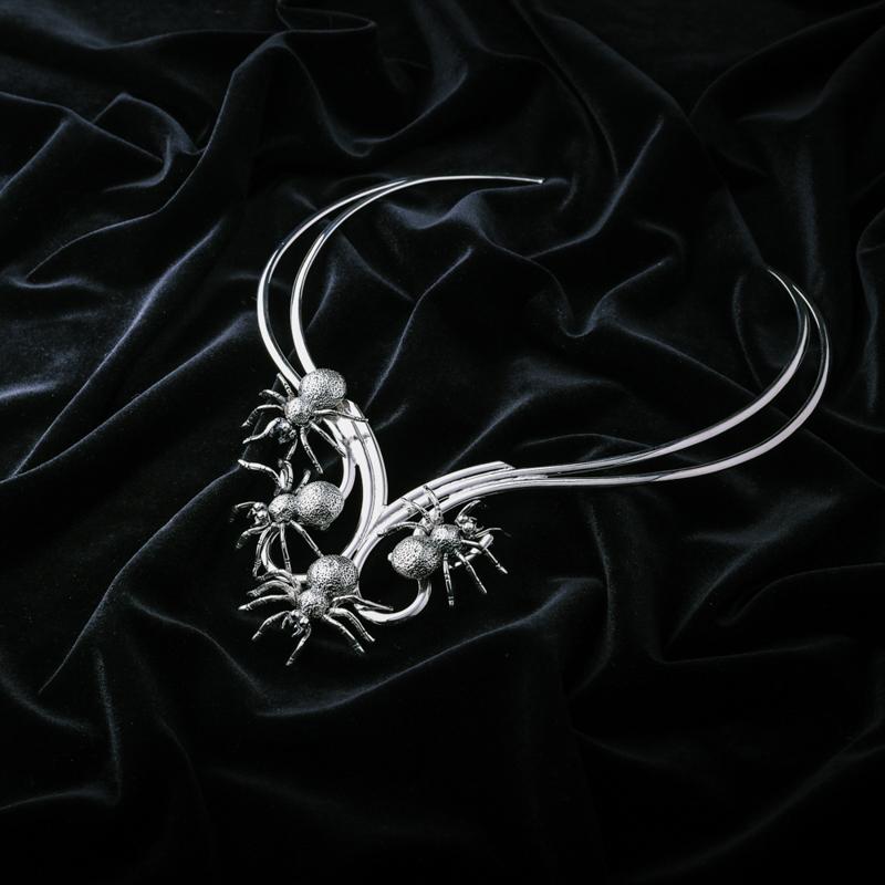 A solid sterling silver collar featuring the suggestion of silken threads, upon which a cluster of spiders sit poised to strike. The exquisite silver workmanship has an oxidised finish which accentuates the stunning detail in this creation and the articulated legs of the spiders bring a lifelike and fun dimension to the piece. This is a statement collar with a difference and a talking point for any spider or gothic jewellery lover or a collector wishing to add a unique jewellery creation to their collection.