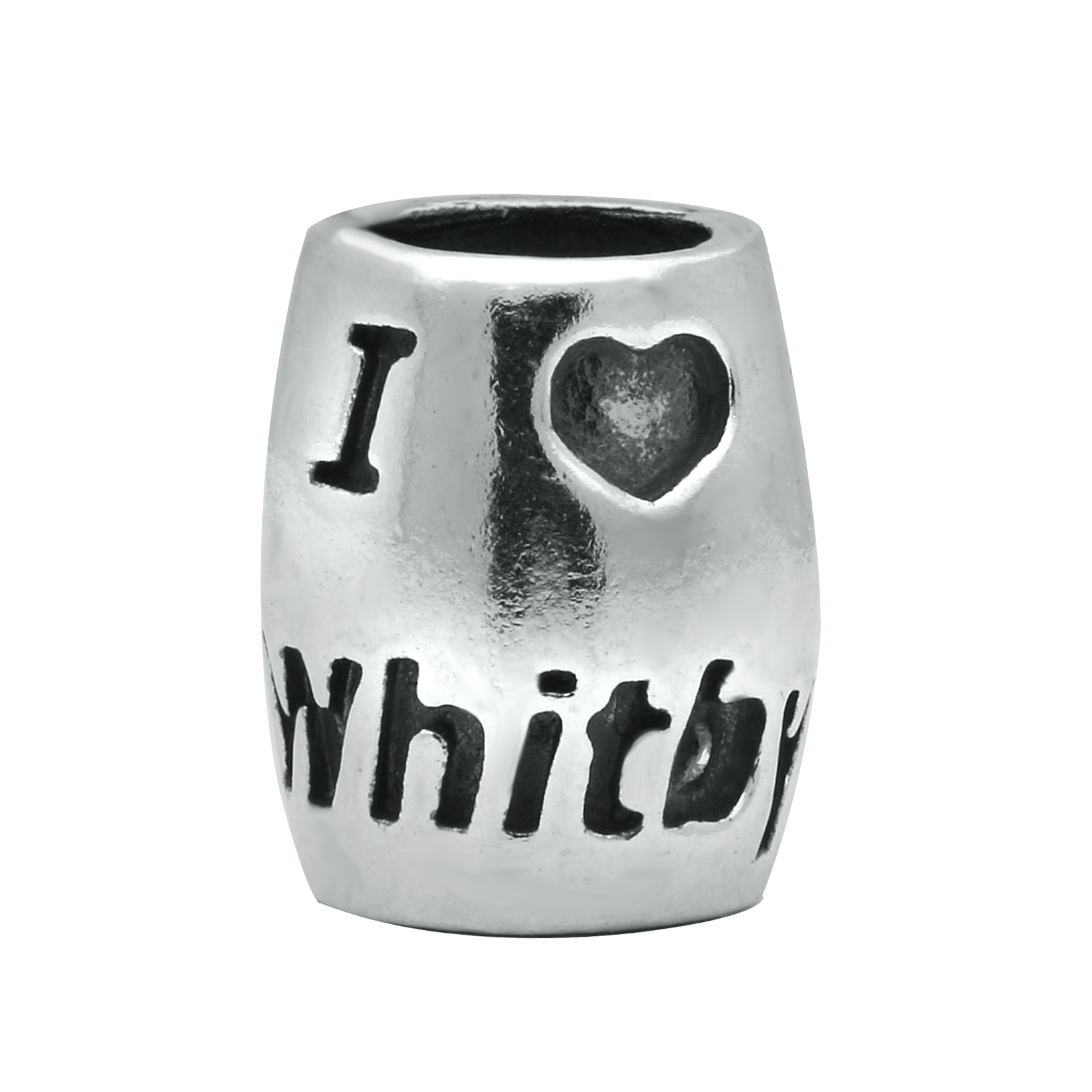 This romantic charm features the words 'I Heart Whitby' engraved into the beautiful sterling silver barrel design alongside the Whitby Abbey. The elegant charm celebrates the heritage of the Yorkshire seaside town and is easily attached to your bracelet for a unique finish.