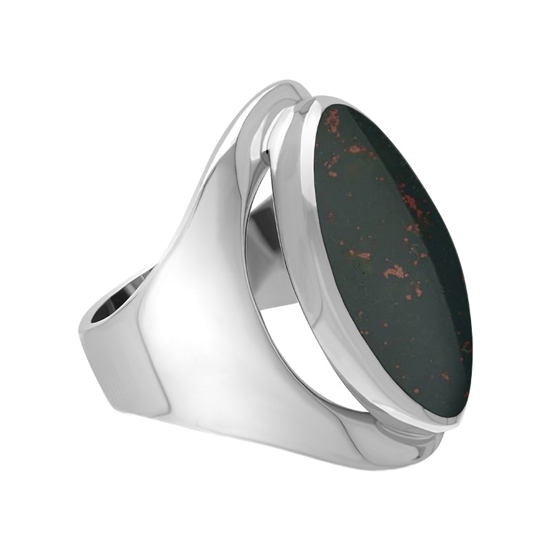 This stunning statement ring shows off a generous quantity of sterling silver and is set with a large oval, hand polished Bloodstone gemstone. This contemporary piece has an open shank underneath the stone, providing added comfort when worn and a thick band.