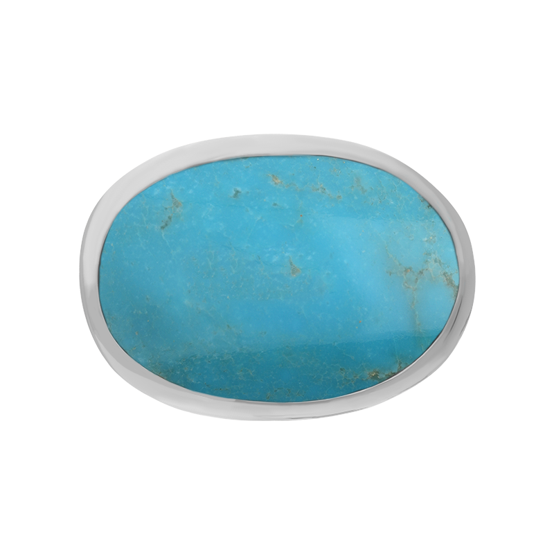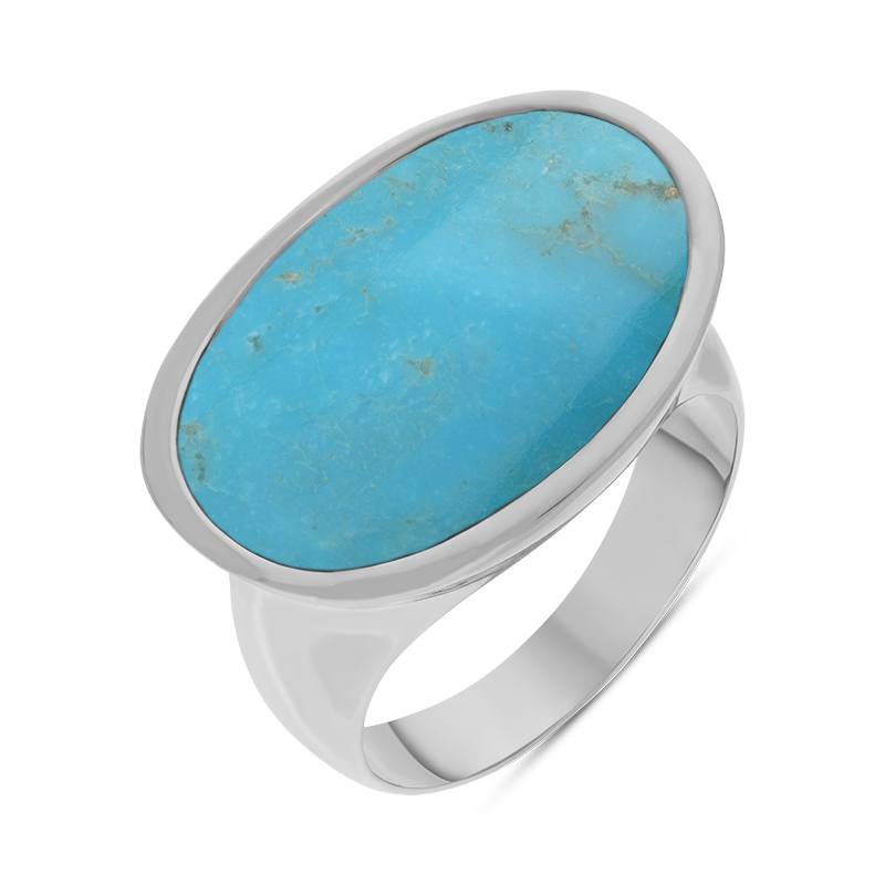 This elegant ring features a stunning oval cabochon of hand carved Turquoise which has been sourced directly from the famous Kingman mine in North Western Arizona. The gemstone is set within an exquisite sterling silver base and completed with a wide statement sterling silver band.