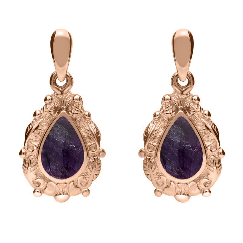 9ct Rose Gold Blue John Pear Shaped Leaf Drop Earrings, E083.
