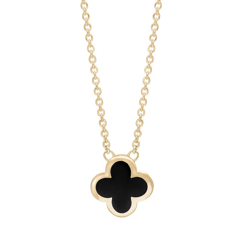 9ct Yellow Gold Whitby Jet Bloom Small Four Leaf Clover Polished Edge Pendant, N1152