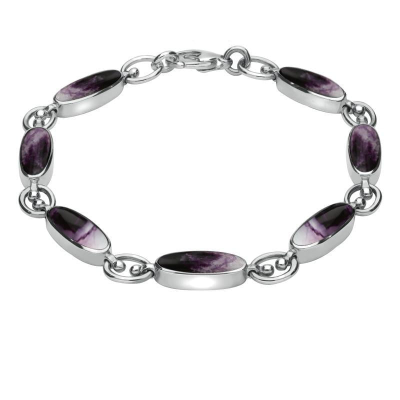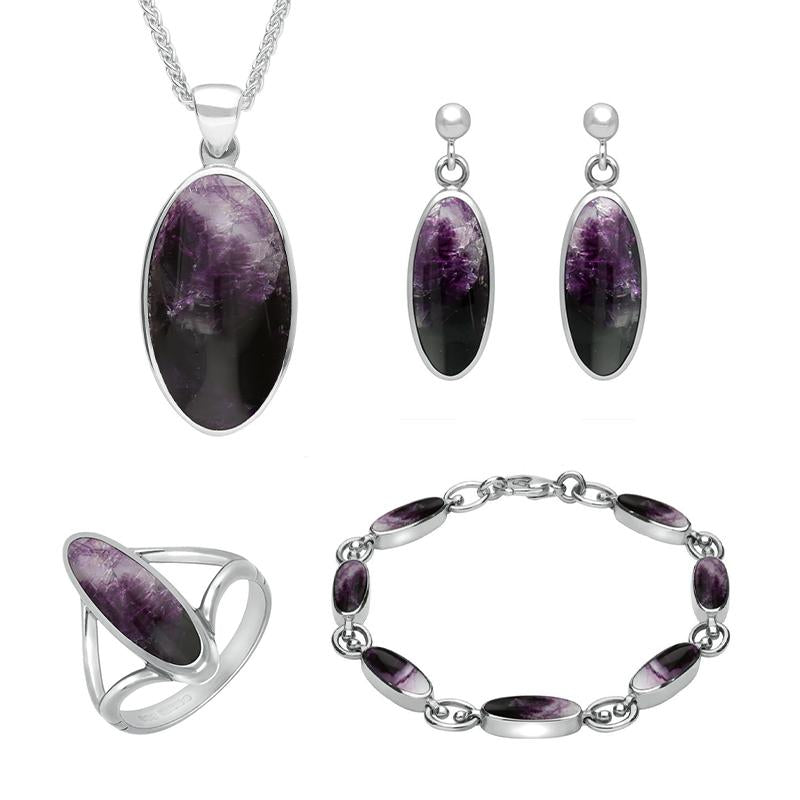 This traditional four piece set of jewellery features hand carved elongated oval Blue John gemstones, sourced directly from Castleton, Derbyshire, each polished to an immaculate shine. Each piece is surrounded by a modern sterling silver setting. Comprising of a pair of drop earrings, ring, bracelet and necklace, complete with an 18 inch sterling silver chain. All items can be sold separately.