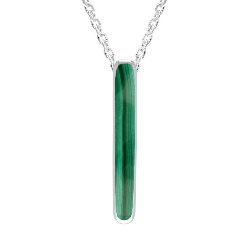 With minimalist design and a distinct architectural edge, this elegant drop pendant necklace features a 25mm long hand cut Malachite gemstone framed in a contemporary sterling silver setting. The pendant is presented on a fluid 18 inch long sterling silver chain, which has a lobster style clasp for easy opening and closing.