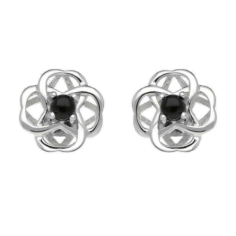 A perfect gift for a loved one, this beautiful sterling silver and Whitby Jet two piece set features a hand carved round shaped Whitby Jet gemstone, which is framed by an open round flower of solid sterling silver. Comprising of a pair of stud earrings, and necklace, complete with an 18 inch sterling silver chain. All items can be sold separately.