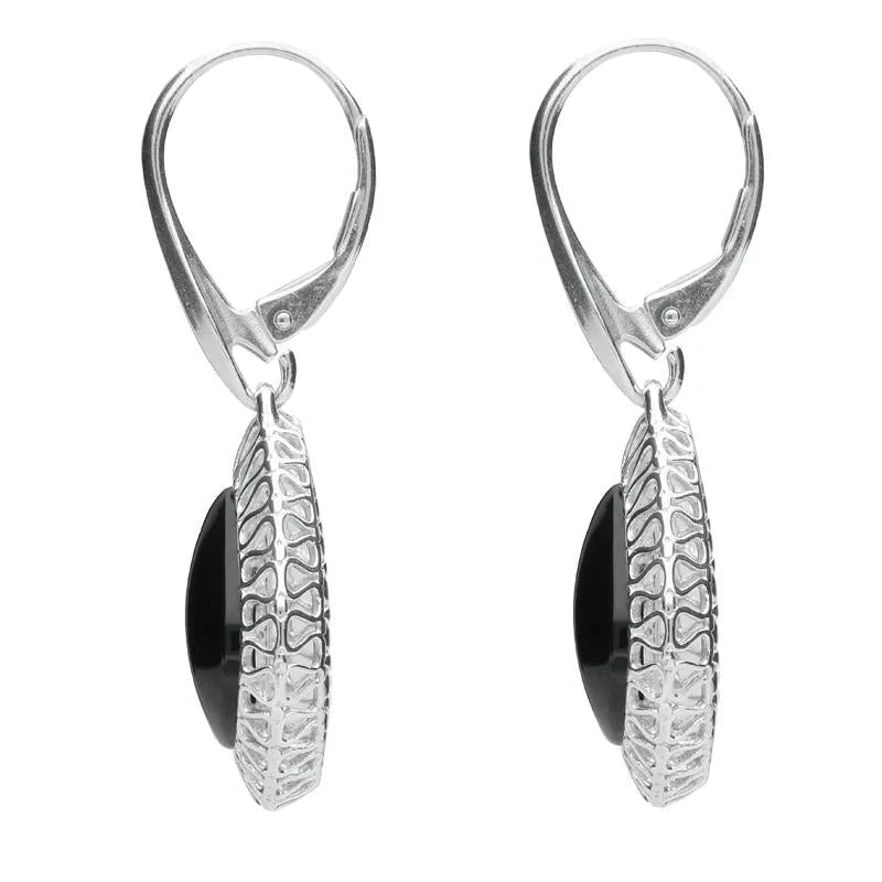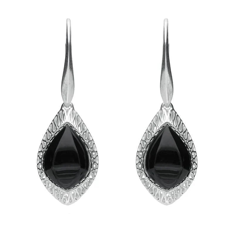 These exquisite earrings feature two stunning pear shaped cabochons of the finest Whitby Jet stone, sourced directly from the north east coast of Yorkshire. The stones are placed in beautiful sterling silver swirl frames for a stylish finish. The unique sterling silver earrings are perfect for everyday wear and are easily secured with hook fastenings.