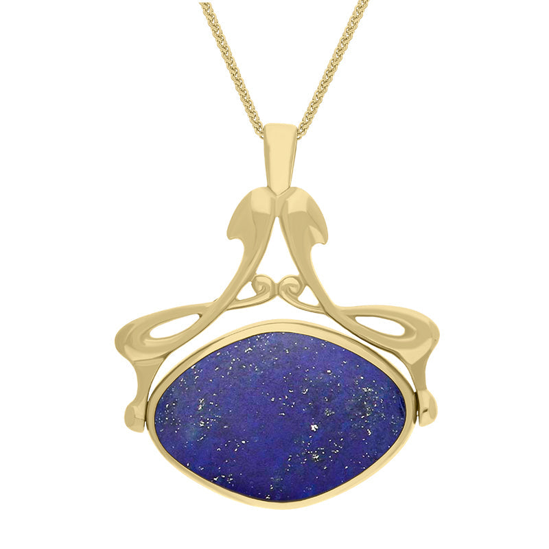 This stunning pendant features Whitby Jet and Lapis Lazuli gemstones set in an eye catching 18ct Yellow Gold design. Hand carved to a bell diamond shape, the clean cut edges and mirror like shine make this pendant contemporary and unique. Presented on an 18 inch 18ct Yellow Gold chain through a fixed bail at the top.